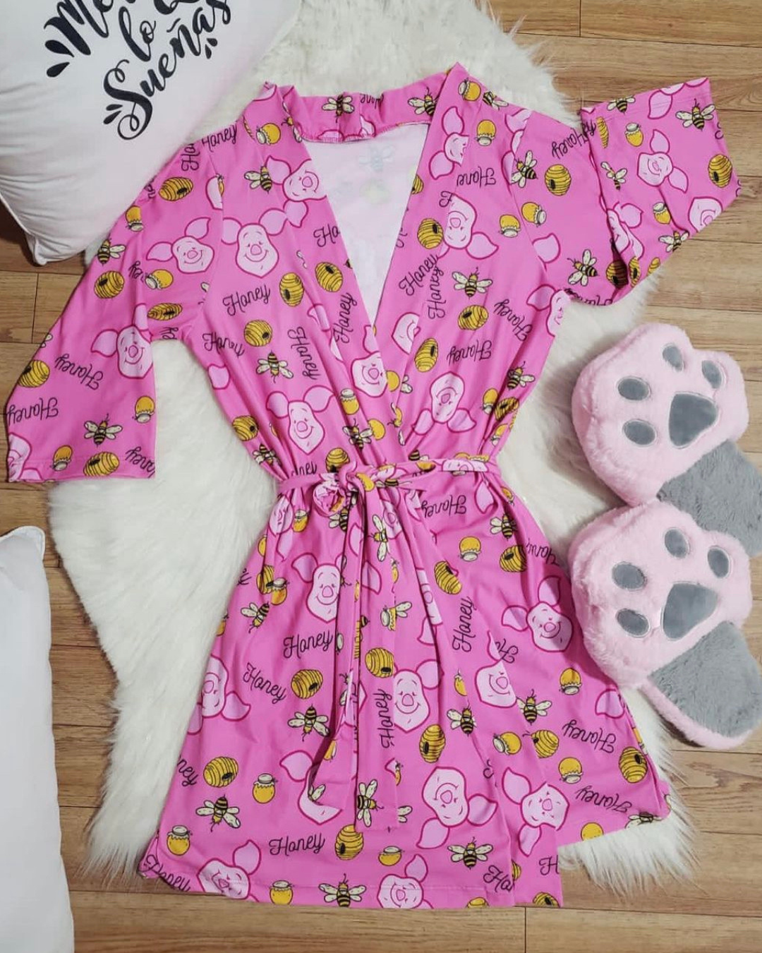 Bata Irene – Línea Soy Icónica. Bata tipo kimono con estampado de Piglet y abejitas sobre fondo fucsia. Tela suave y ligera con amarre a la cintura. Estilo cute, dulce y lleno de personalidad.