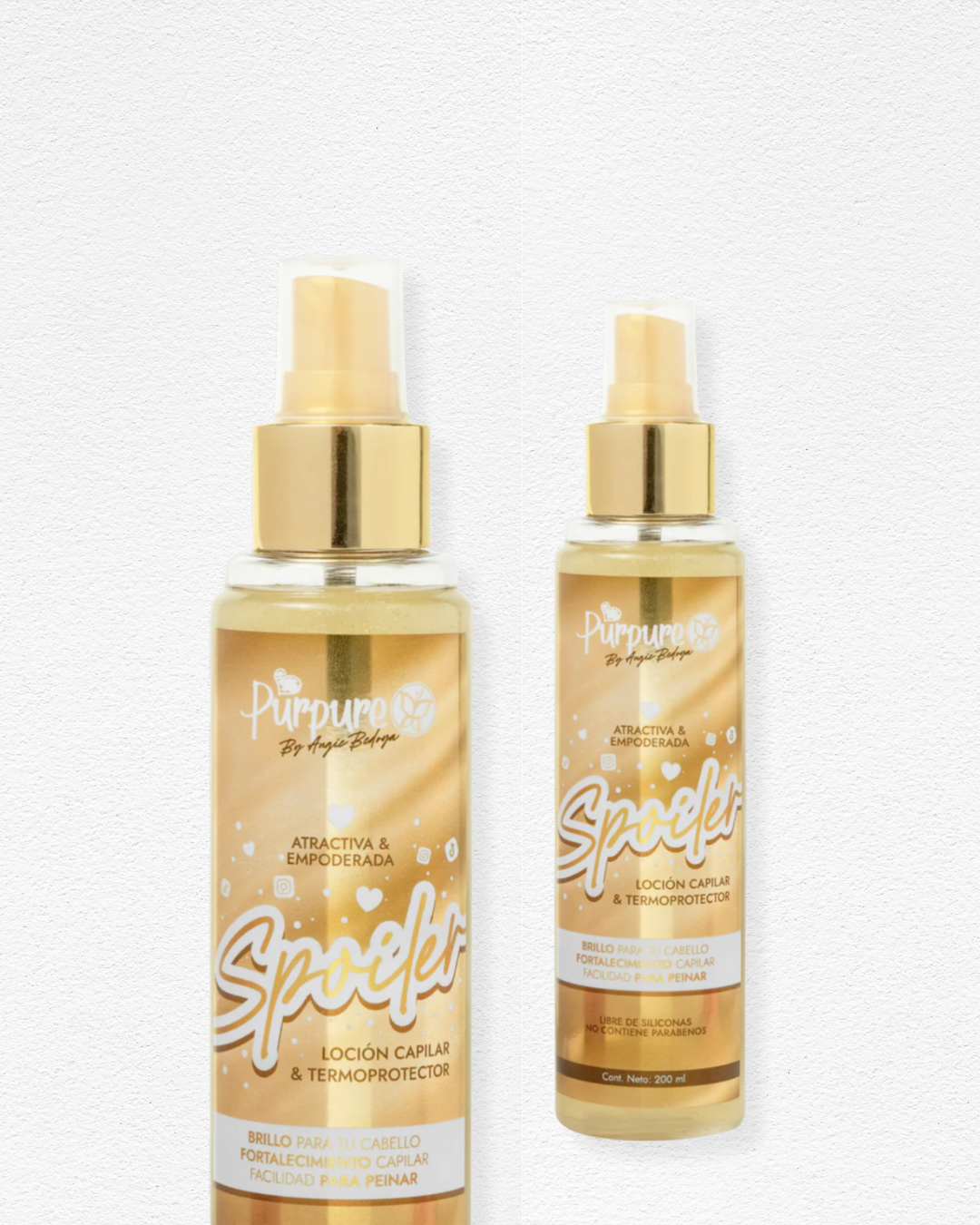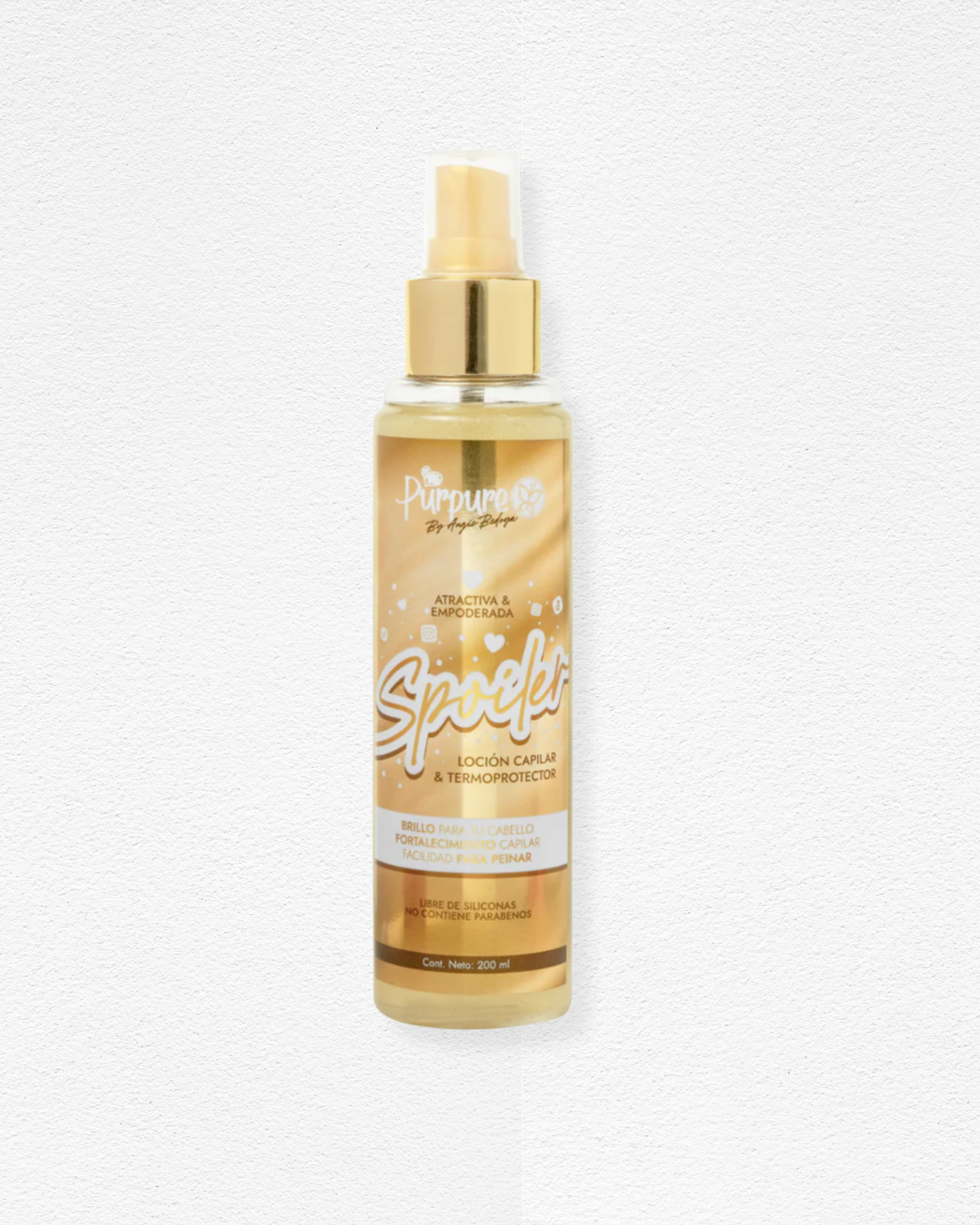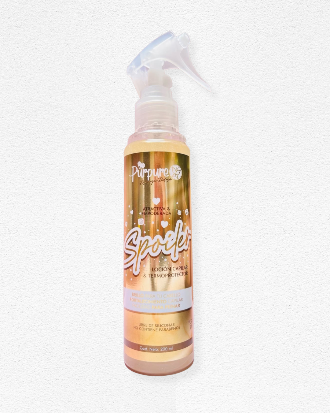 Spoiler de Purpure es una loción capilar multifuncional que combina brillo, suavidad, protección térmica y fortalecimiento en una sola fórmula. Su textura ligera y sin siliconas la hace ideal para usar antes del secado o planchado, sin dejar sensación pesada ni grasosa. Además, ayuda a desenredar el cabello con facilidad, dejando un aroma delicioso y un acabado digno de portada.