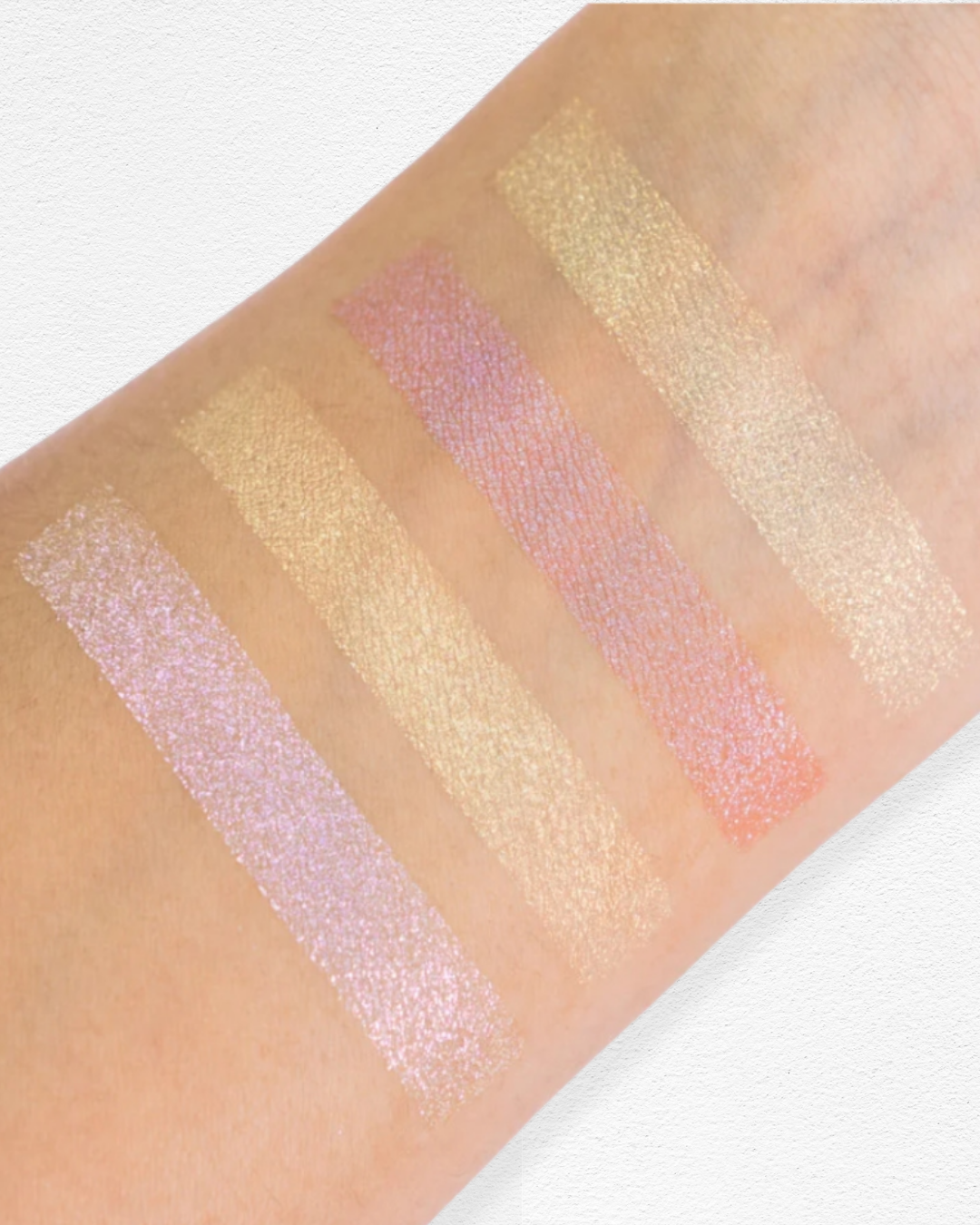 La paleta Cosmos es magia pura en forma de iluminadores. Cuatro tonos ultra brillantes con reflejos multidimensionales que puedes usar como iluminador, sombra de ojos o toque final en el maquillaje. Cada tono te transporta a una galaxia distinta, y los diseños adorables de gatitos flotando entre planetas la hacen irresistible.