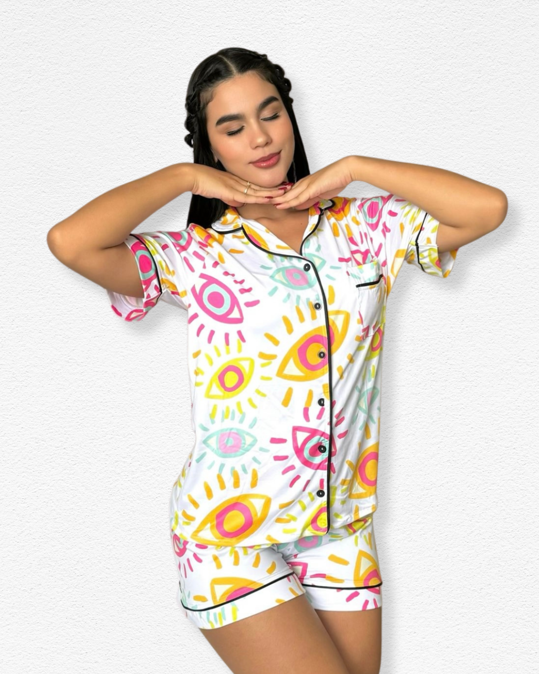 Dale un toque de ternura, color y frescura a tus noches con la pijama Amara. Su diseño vibrante, lleno de estampados originales, convierte el descanso en una experiencia aesthetic y divertida. Ideal para quienes adoran los detalles cute y aman sentirse cómodas sin dejar de verse fabulosas.