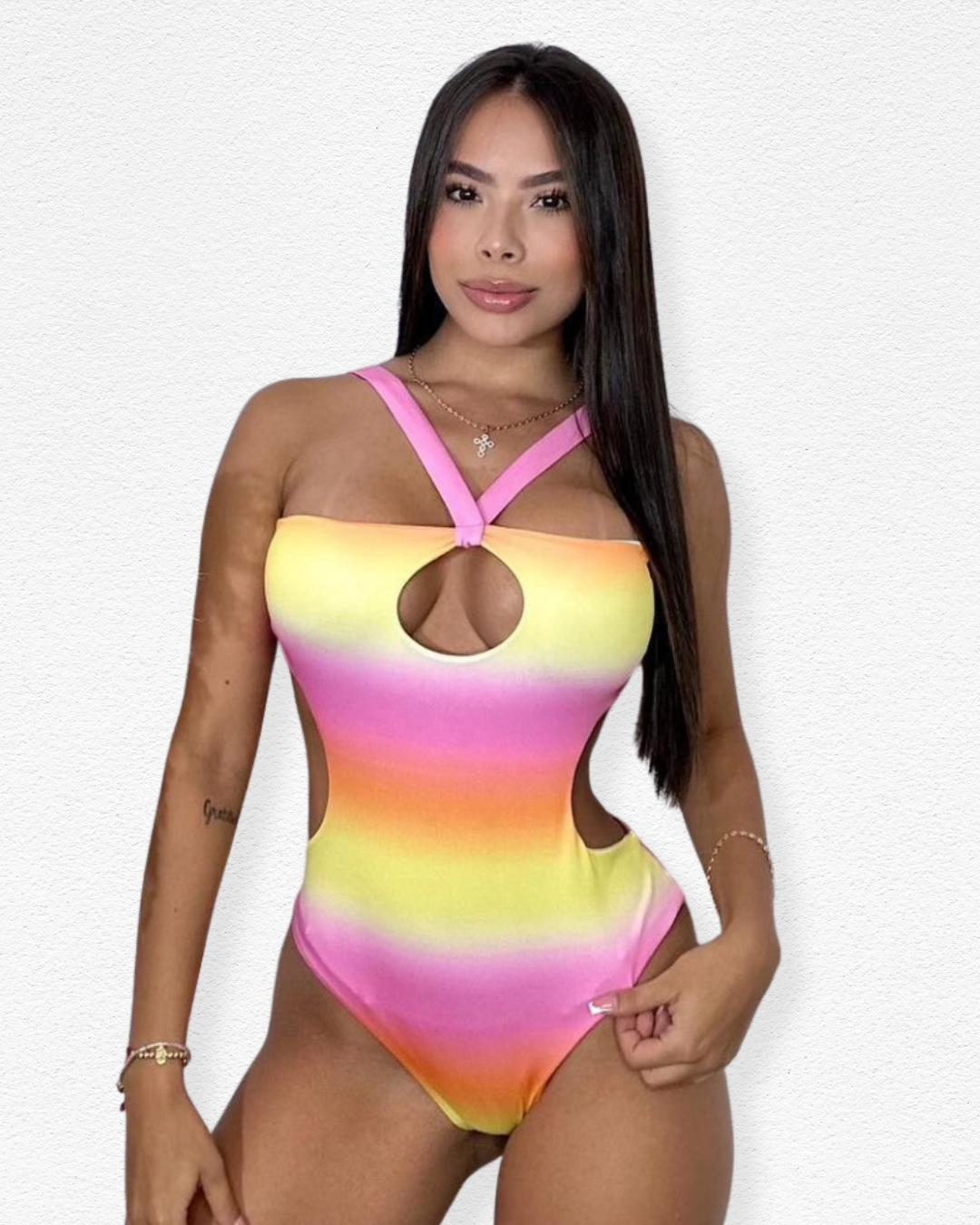 Este set no solo es perfecto para la playa, también puedes usarlo como mini vestido para un look chic y relajado. Los tonos degradados en rosa, naranja y amarillo evocan los atardeceres más mágicos del verano.